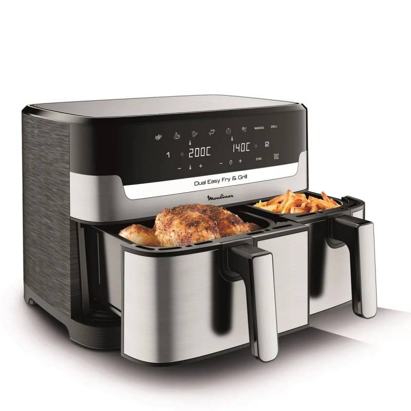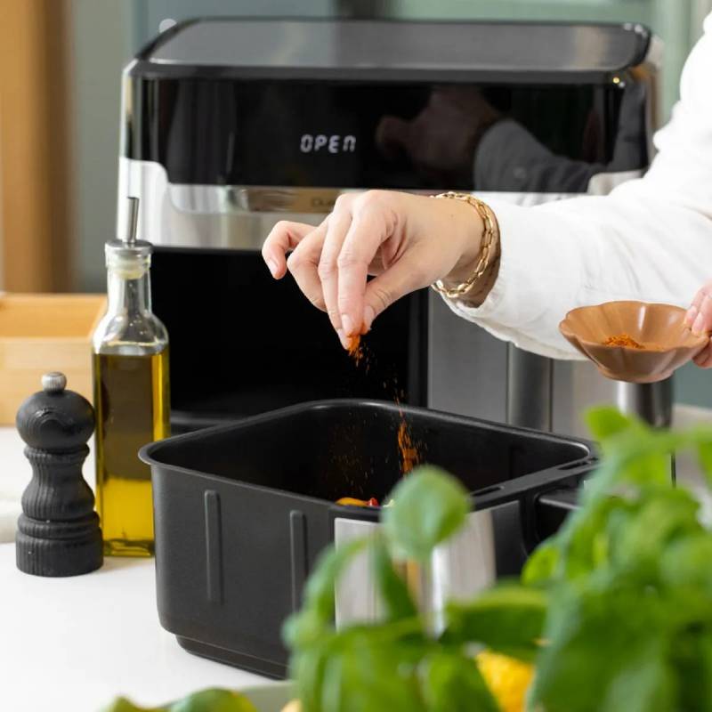 -Menú completo: Utilizá el cajón extragrande para alimentos voluminosos (carne/pollo) y el pequeño para guarniciones. Usá solo el pequeño para ahorrar energía cuando cocines solo para vos. Programá dos comidas diferentes a la vez y lográ un menú completo al mismo tiempo.