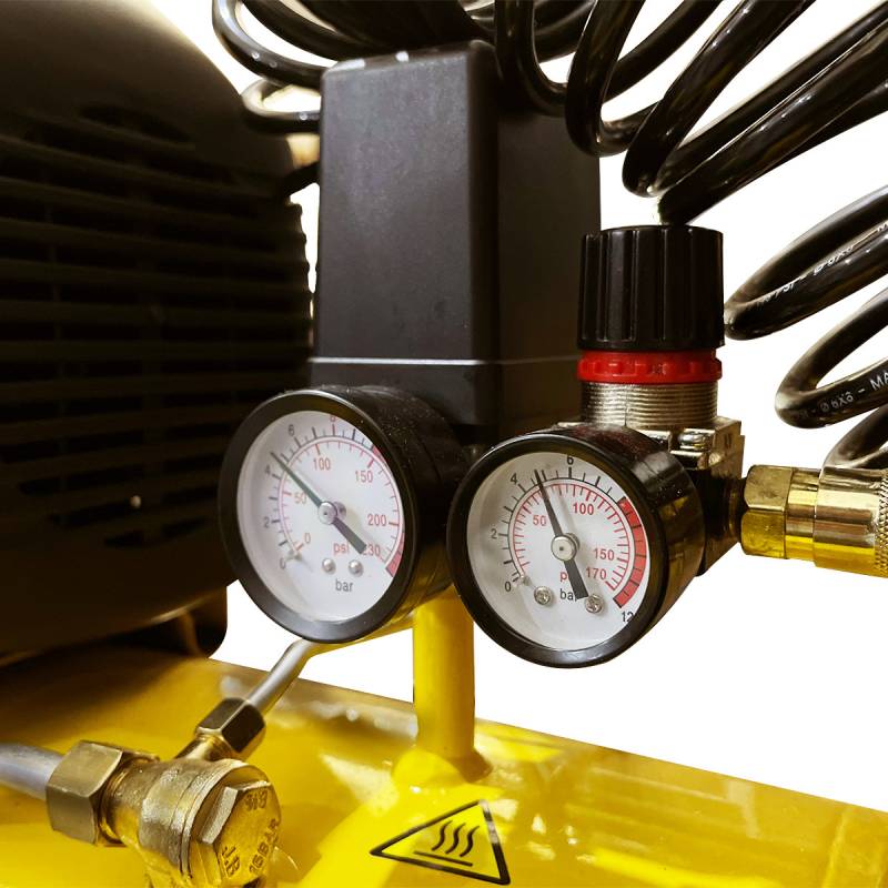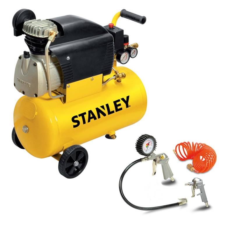 Compresor 24L Stanley + 4Pz Kit de 4 piezas: Pistola de pintar con deposito superior, pistola para inflar neumáticos con manómetro, Pistola de sopletear progresiva (progresiva es una pistola que permite regular el flujo en base a la posición del gatillo.) y manguera de alta presión 5 Mts.