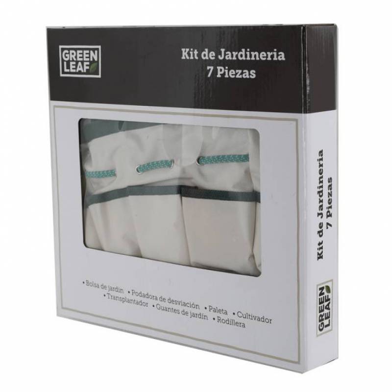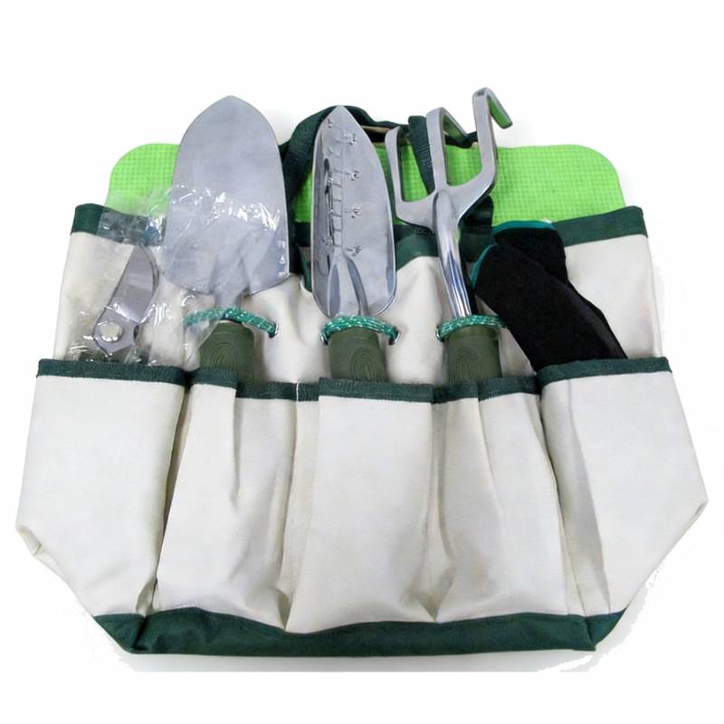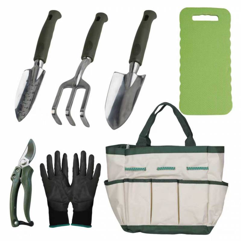 Juego de jardinería de 7 piezas, de uso generalizado en trabajos de jardinería: paleta de aluminio, trasplantador, rastrillo con mango de plástico, guantes, bolsa, rodillera. Un juego de herramientas de jardinería bonito y duradero.