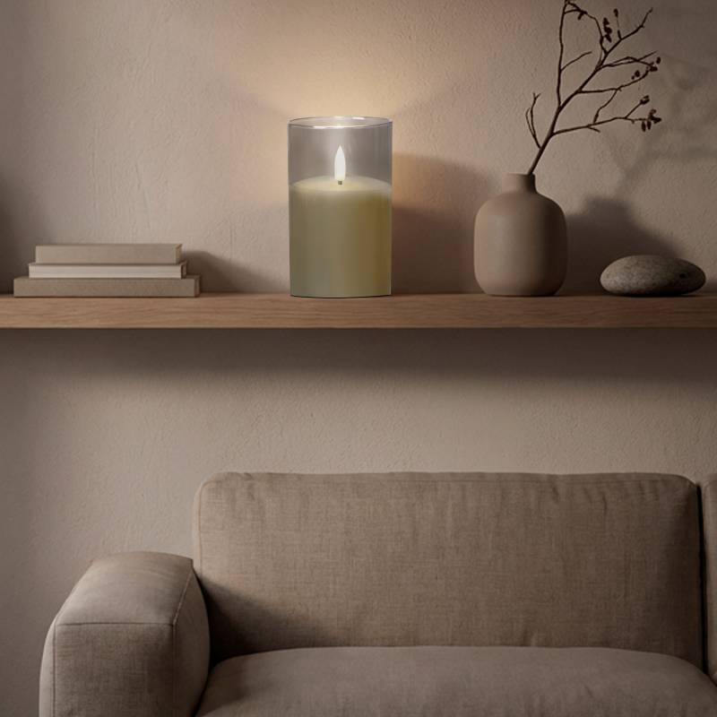 Vela led decorativa de 10 cm en recipiente de vidrio, ideal para aportar un toque elegante y cálido a cualquier ambiente. Emite una luz suave y segura, sin humo ni calor, perfecta para decorar mesas, repisas o rincones especiales.