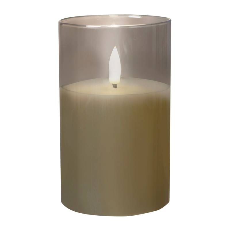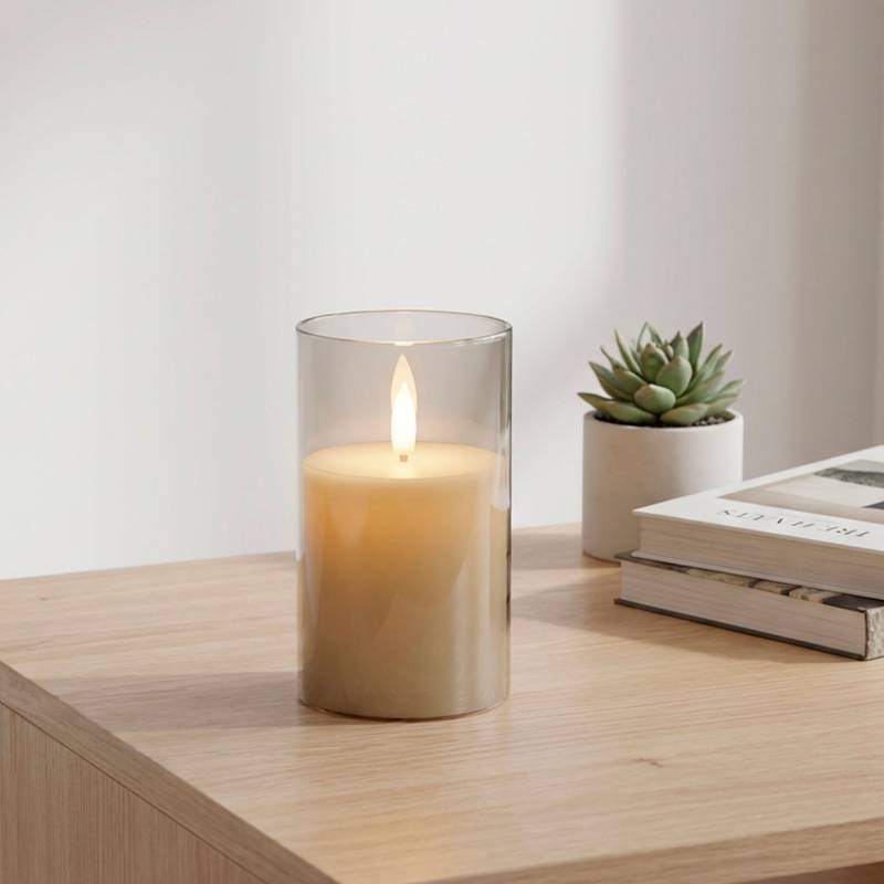 Vela led decorativa de 15 cm en recipiente de vidrio, ideal para aportar un toque elegante y cálido a cualquier ambiente. Emite una luz suave y segura, sin humo ni calor, perfecta para decorar mesas, repisas o rincones especiales.